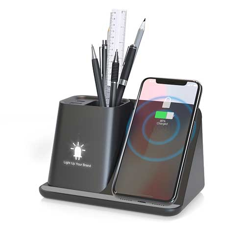 Bežični punjač Inverno, držač olovaka sa dva porta za USB, i led svetlom logotipa koji se gravira.