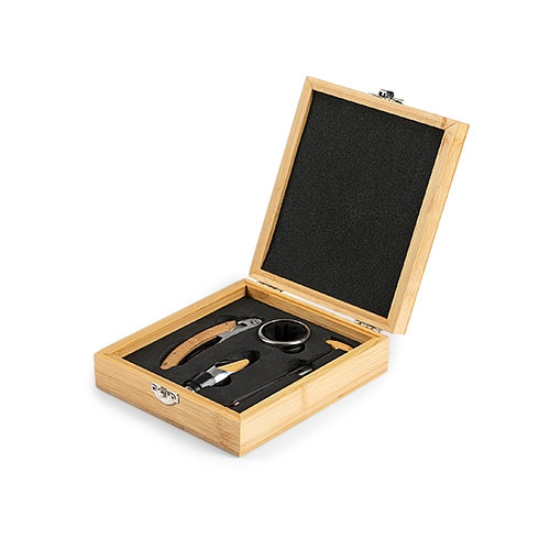 Vinski set Merlot u drvenoj poklon kutiji sa 4 elementa. Kutija se sastoji od najneophodnijih elemenata za otvaranje i sipanje vina. Poklon koji svi koriste u svojim domovima,tako da će vaš brend svima uvek biti na oku.: